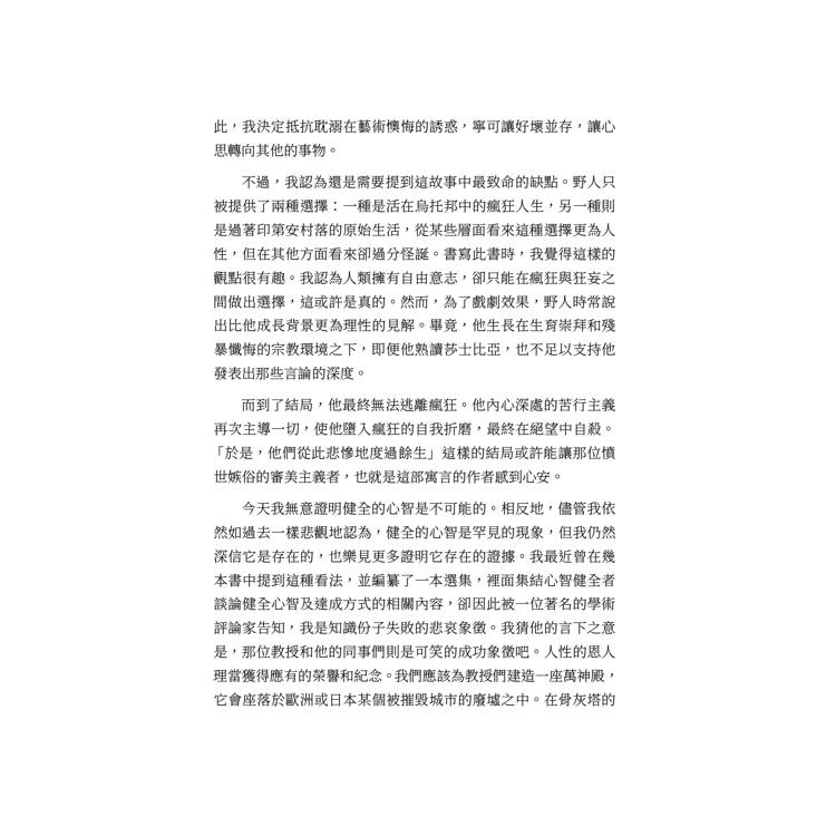 作為一部藝術作品,它的缺陷相當明顯,但若要修正這些缺陷,我就必須重寫整本書。然而,隨著年歲增長,在重寫的過程中,我可能不僅會除去原有的錯誤,也會消滅它本來的優點。因此,我決定抵抗耽溺在藝術懊悔的誘惑,寧可讓好壞並存,讓心思轉向其他的事物。
