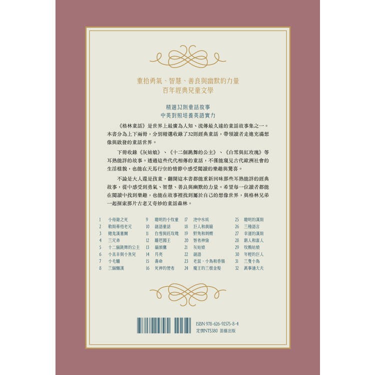 本書《世界經典文學:格林童話 穿越古老的故事之門×收錄64篇經典童話故事(中英對照)》共分為上下冊,每冊收錄三十二篇精選故事,特別添加了英文對照版本,讓讀者在欣賞經典童話的同時,也能提升英語能力。這並不是單純的語言學習,而是一場伴隨故事節奏的奇幻旅程;每篇故事都是一扇門,引領讀者穿越森林、城堡與魔法世界,親身感受語言的韻律、故事的張力與文學的魅力。