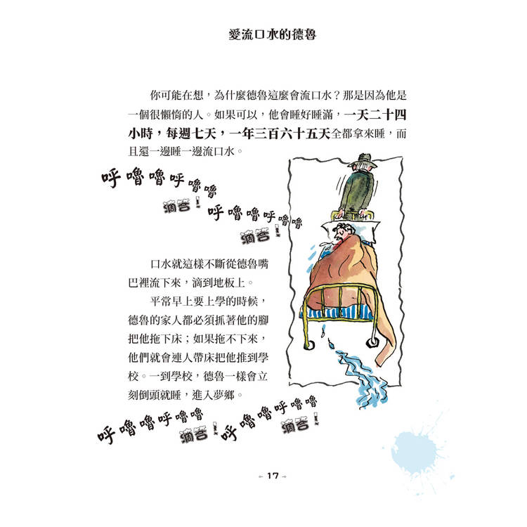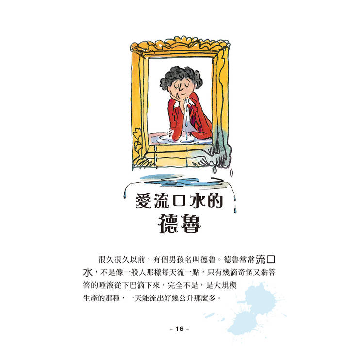 很久很久以前,有個男孩名叫德魯。德魯常常流口水,不是像一般人那樣每天流一點,只有幾滴奇怪又黏答答的唾液從下巴滴下來,完全不是,是大規模生產的那種,一天能流出好幾公升那麼多。