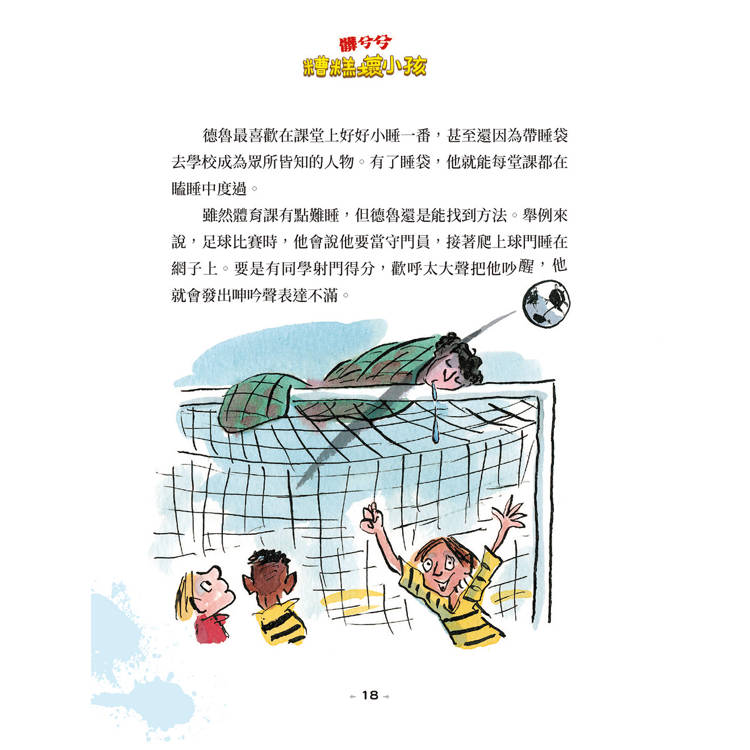 雖然體育課有點難睡,但德魯還是能找到方法。舉例來說,足球比賽時,他會說他要當守門員,接著爬上球門睡在網子上。要是有同學射門得分,歡呼太大聲把他吵醒,他就會發出呻吟聲表達不滿。
