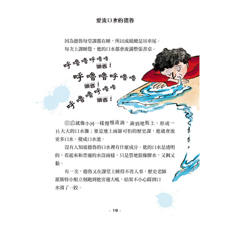 口水就像小河一樣慢慢流淌,滴到地板上,形成一片大大的口水灘;要是連上兩節可怕的歷史課,他就會流更多口水,變成口水池。