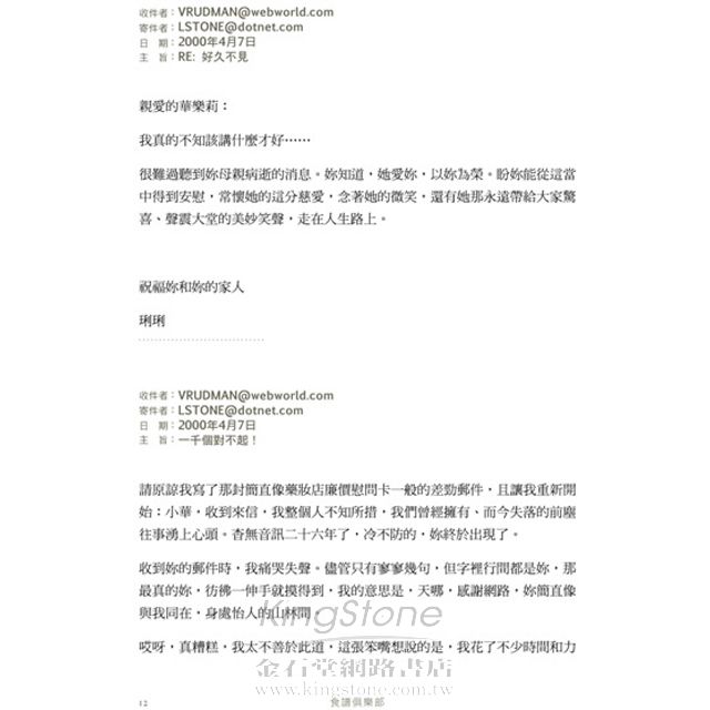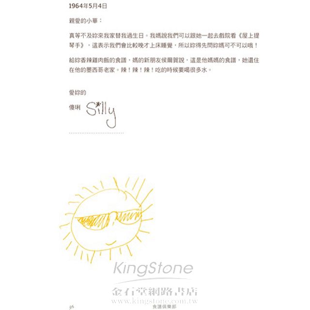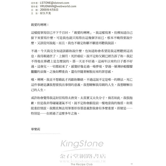 藉著書信往返,這本書帶領讀者走上令人胃口大開又引人深思的旅程。家族祕密、終生的友誼和各式各樣的開胃菜、主菜與甜點,交織融合成內容豐富的故事,不僅溫暖人心,而且叫人食指大動。 ─珍妮佛.柯蒂.艾普斯坦,《上海畫家》的作者