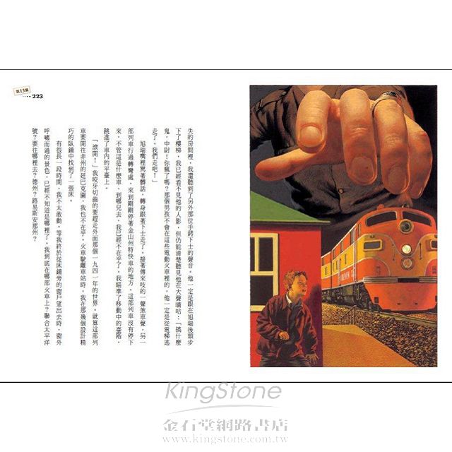 爸爸蹲了下來。「我會給你寫信,」他輕聲在我耳邊講:「我會寫很多信,等我在那邊找到了好工作」──他的眼睛都模糊了──「你就搭金山州特快車過來找我,我會給你寄車票回來,然後在洛杉磯火車站等你。保證,小奧。」