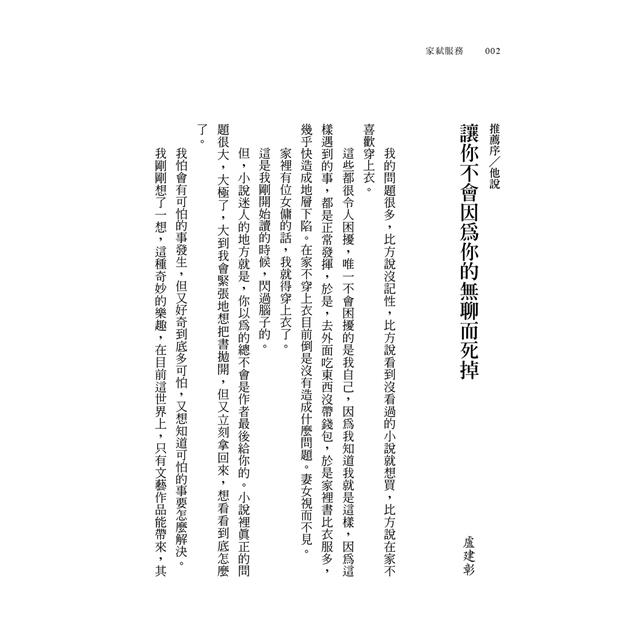 不論如何,只要先挑好姿勢,給足久坐、追讀的空間與物質條件,必能享用這番「家弒服務」,獲得掩卷後舒心暢快、安適愜意的日常。