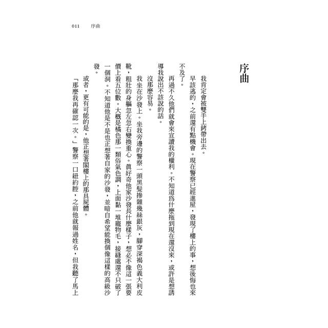 然後,開篇的那個疑問鷹架,馬上像是熱火烹油似的刺激讀者又驚又疑,到底「嫌犯說話、警察在場、屍體在樓上」的局要怎麼解,會是大快人心的解氣式正義?還是魚死網破一鍋爛的警世寓言?