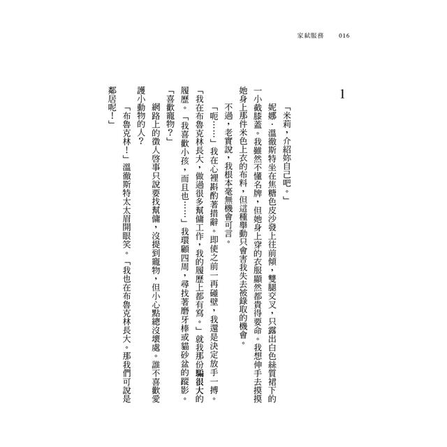 我感覺到腦門充血,幾乎有點暈。我們很樂意雇用妳。這女人是認真的嗎?妮娜.溫徹斯特這樣的貴婦想請我去她家幫傭──而且還住在那裡。