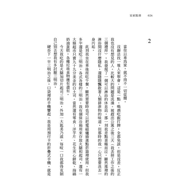 此刻我坐在車後座吃午餐,雖然需要時也可以把電磁爐插進點菸器裡使用,但我多半還是吃三明治。硬吞下一半三明治之後,口袋裡的手機響起。我是用預付卡的折疊式手機,就是那種只有想殺人放火或回到十五年前才會用的復古手機。但我需要一支手機,也只買得起這種。