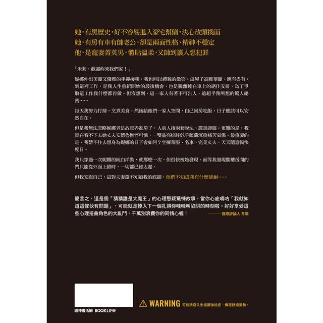 妮娜伸出美麗又優雅的手迎接我,我也回以禮貌的微笑。這屋子高雅華麗、應有盡有,到這裡工作,是我人生重新開始的最後機會,也是脫離睡在車上的絕佳安排,為了爭取這工作我什麼都肯做。但沒想到,這一家人有著不可告人、遠超乎我所想的驚人祕密……