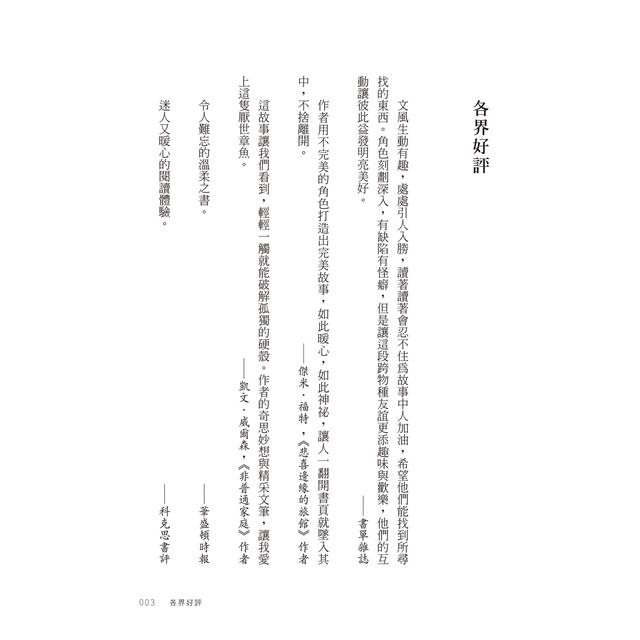 ▲ 文風生動有趣,處處引人入勝,讀著讀著會忍不住為故事中人加油,希望他們能找到所尋找的東西。角色刻劃深入,有缺陷有怪癖,但是讓這段跨物種友誼更添趣味與歡樂,他們的互動讓彼此益發明亮美好。──書單雜誌