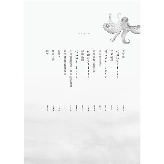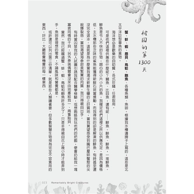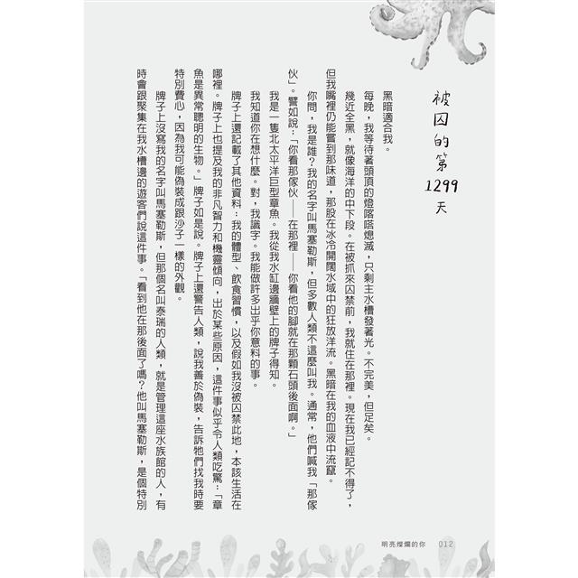 黑暗適合我。 每晚,我等待著頭頂的燈喀嗒熄滅,只剩主水槽發著光。不完美,但足矣。 幾近全黑,就像海洋的中下段。在被抓來囚禁前,我就住在那裡。現在我已經記不得了,但我嘴裡仍能嘗到那味道,那股在冰冷開闊水域中的狂放洋流。黑暗在我的血液中流竄。 你問,我是誰?我的名字叫馬塞勒斯,但多數人類不這麼叫我。通常,他們喊我「那傢伙」。譬如說:「你看那傢伙──在那裡──你看他的腳就在那顆石頭後面啊。」 我是一隻北太平洋巨型章魚。我從我水缸邊牆壁上的牌子得知。 我知道你在想什麼。對,我識字。我能做許多出乎你意料的事。 牌子上還記載了其他資料:我的體型、飲食習慣,以及假如我沒被囚禁此地,本該生活在哪裡。牌子上也提及我的非凡智力和機靈傾向,出於某些原因,這件事似乎令人類吃驚:「章魚是異常聰明的生物。」牌子如是說。牌子上還警告人類,說我善於偽裝,告訴牠們找我時要特別費心,因為我可能偽裝成跟沙子一樣的外觀。 牌子上沒寫我的名字叫馬塞勒斯,但那個名叫泰瑞的人類,就是管理這座水族館的人,有時會跟聚集在我水槽邊的遊客們說這件事。「看到他在那後面了嗎?他叫馬塞勒斯,是個特別的傢伙。」 特別的傢伙。確實如此。 這名字是泰瑞那個年幼的小女兒選的。全名是馬塞勒斯.麥克小管。對,真的是荒謬透頂,害得許多人類以為我是一隻小管,這實在是莫大的侮辱。 你問,那該怎麼稱呼我?呃,隨便你。或許你會跟其他人一樣,就喊我「那傢伙」。我希望你不會,但我也不會這樣就記恨。畢竟,你不過只是個人類呀。 話先說在前,我們相處的時間大概不長。牌子上寫著另一項資訊: 北太平洋巨型章魚的平均壽命,四年。 我的壽命:四年──一千四百六十天。 我在幼年時就被帶到此地,也將死在這裡,在這個水槽內。最長最長,再過一百六十天,我這一生的刑期就滿了。
