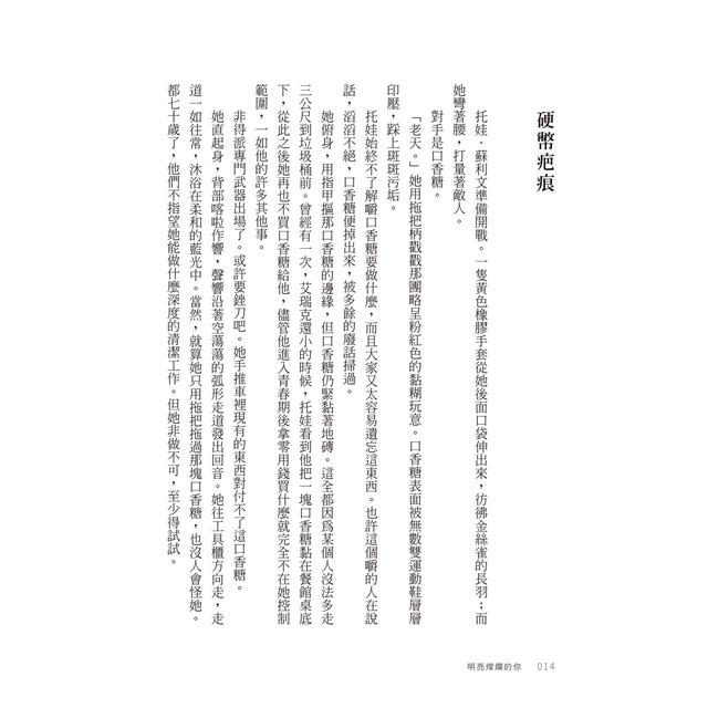 托娃.蘇利文準備開戰。一隻黃色橡膠手套從她後面口袋伸出來,彷彿金絲雀的長羽;而她彎著腰,打量著敵人。 對手是口香糖。 「老天。」她用拖把柄戳戳那團略呈粉紅色的黏糊玩意。口香糖表面被無數雙運動鞋層層印壓,踩上斑斑污垢。 托娃始終不了解嚼口香糖要做什麼,而且大家又太容易遺忘這東西。也許這個嚼的人在說話,滔滔不絕,口香糖便掉出來,被多餘的廢話掃過。 她俯身,用指甲摳那口香糖的邊緣,但口香糖仍緊黏著地磚。這全都因為某個人沒法多走三公尺到垃圾桶前。曾經有一次,艾瑞克還小的時候,托娃看到他把一塊口香糖黏在餐館桌底下,從此之後她再也不買口香糖給他,儘管他進入青春期後拿零用錢買什麼就完全不在她控制範圍,一如他的許多其他事。 非得派專門武器出場了。或許要銼刀吧。她手推車裡現有的東西對付不了這口香糖。 她直起身,背部喀啦作響,聲響沿著空蕩蕩的弧形走道發出回音。她往工具櫃方向走,走道一如往常,沐浴在柔和的藍光中。當然,就算她只用拖把拖過那塊口香糖,也沒人會怪她。都七十歲了,他們不指望她能做什麼深度的清潔工作。但她非做不可,至少得試試。 再說,這樣她才有事可做。 托娃是索維爾灣海洋生物博物館最年長的員工。她每天晚上來此拖地、擦玻璃、清空垃圾桶。每隔兩個星期,她會在休息室置物櫃收到一張直接存入帳戶的薪資單。時薪十四美元,得再扣除必要的稅金和扣除額。 這些存根全都拆也沒拆,直接塞進她冰箱上方的舊鞋盒。錢一點點積攢到她在索維爾灣信用合作社的帳戶裡,但那戶頭她根本置之腦後。 這會兒她闊步走向工具櫃,堅定的步伐踩得飛快,以普通人的標準來說已經很了不起,而以這樣一個嬌小、駝背、骨細如鳥的老婦來說,更是極其驚人。在頭頂上方,雨滴打在天窗上,隔壁舊渡輪碼頭的安全照明燈從上方投來刺眼光線。玻璃上銀色的水滴迅速滾落,在起霧的天空底下劃出一絲絲閃亮的絲帶。大家一直說今年六月糟透了。灰暗的天氣並不礙著托娃,不過如果雨能停一陣子,讓她的前院乾透倒也不錯,她的手推式割草機一濕就會堵塞。 水族館是一座甜甜圈形狀的圓頂建築,中央有一座主水槽,小水槽環繞外圍,整棟建築不特別大或氣派,或許正適合索維爾灣,這地方本身也是不大不氣派。從托娃發現口香糖的地點走過來,工具櫃遠在水族館另一端,她的白運動鞋嘎唧嘎唧踩過一塊她已經掃過的地方,在明淨的磁磚上留下糊糊的腳印。不消說,這塊地她會重新拖過。 她在淺淺的壁龕那裡停下。壁龕這裡有一座比照真實大小的太平洋海獅青銅雕像,幾十年來被孩子們摸呀爬的,光禿的頭和背部都給磨得光溜,上頭的圓滑斑點為海獅更添幾分逼真。托娃家裡的壁爐架上有幀艾瑞克的照片,約莫十一、二歲的他,跨坐在海獅雕像背上,咧嘴燦笑,像要拋繩圈似的高舉起一隻手。海洋牛仔。 那是他最後幾張顯得稚氣和無憂無慮的照片之一。托娃按時間順序保存艾瑞克的照片:這是呈現他蛻變過程的蒙太奇。從大笑露出牙齦的嬰兒,到個頭高過父親、穿著棒球外套擺拍的俊俏青少年;在校友返校日別上花飾;在深藍的普吉特海灣,搭建在岩岸邊的臨時領獎台上,他手握著高中划船比賽的獎盃。經過時,托娃撫摸海獅冰涼的頭部,忍住再次想像艾瑞克現在應該長什麼模樣的衝動。 她繼續前進,一如應當,走過黝暗的走道。來到藍鰓太陽魚的水槽前,她停下。「晚安,親愛的。」 接著是日本蟹。「哈囉,美人兒。」 「你好嗎?」她問候了尖吻斜杜父魚。 狼鰻非托娃所好,但她仍點頭致意。人不能失禮,儘管狼鰻令她聯想到丈夫威爾生前養成習慣在半夜看的第四台恐怖片;那時他因為化療作嘔,夜不成眠。最大的那尾狼鰻滑出牠的岩穴,嘴型固定在牠那戽斗蹙額的經典表情,參差不齊的牙如一根根細針,自下顎暴出。說牠長得不幸是含蓄了。但說回來,外表會騙人,不是嗎?托娃對狼鰻微笑,而牠生得那樣的一張臉,縱使想也不可能回她一笑。 接下來的展示動物是托娃的最愛。她湊近玻璃。「呃, 先生,您今天過得如何呀?」 她花了片刻才找到他:一道橘色躲在岩石後方。看得見,但會讓人誤以為是孩童在玩捉迷藏時露出了馬腳:小女孩的馬尾從沙發後面突出來,或一隻穿著襪子的腳丫伸出了床底。 「今晚害羞呀?」她退後,靜靜等待;那隻北太平洋巨型章魚仍動也不動。她想像白天時,大家用指關節敲打玻璃,還看不到,便惱怒走開。這年頭大家都不懂得保持耐心了。 「也不能怪你,那後面看起來真的很舒服。」 那條橘色的觸腕抽搐一下,但他的軀幹仍舊躲在後面。 口香糖英勇抵擋著托娃的銼刀,但最終還是給刮起來了。 托娃將那團外面結成硬殼的口香糖投進垃圾袋,口香糖劃過袋子,發出令人滿意的微弱嗖聲。 然後她拖地。重新拖過。 濕地磚飄散摻雜檸檬的醋味,瀰漫在空氣中。這比托娃剛上工時,他們以前用的可怕溶液好多了,那鮮綠色的垃圾玩意,都快把她鼻孔給灼傷了。她當下就據理力爭,說第一,那東西讓她頭暈;第二,那會在地板上留下不雅觀的痕跡;而且最糟的或許是,那聞起來像威爾病房的味道,像生病的威爾,儘管托娃將這條抱怨擺在心底。 工具室的架上滿是一罐罐那種綠色的垃圾玩意,但水族館館長泰瑞最後聳聳肩,說她想用什麼就用吧,但是請她自己帶來。想當然,托娃同意了。因此她每晚扛一罐
