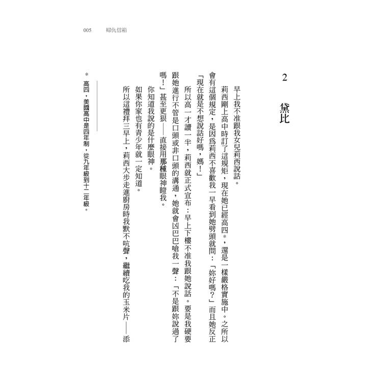然而,最近她的生活突然變得一團亂。不但丟了工作,兩個青春期女兒也不太對勁,丈夫更有事情瞞著她,她在他手機上安裝的定位追蹤APP就是鐵證。黛比受夠了當逆來順受、冷靜理性、實事求是的人。該是她把勸別人的話付諸行動的時候了。