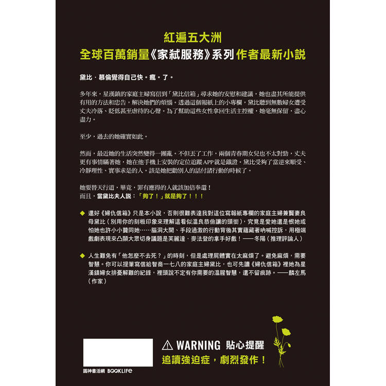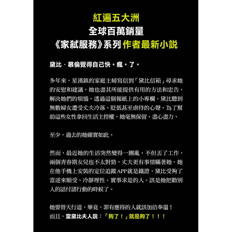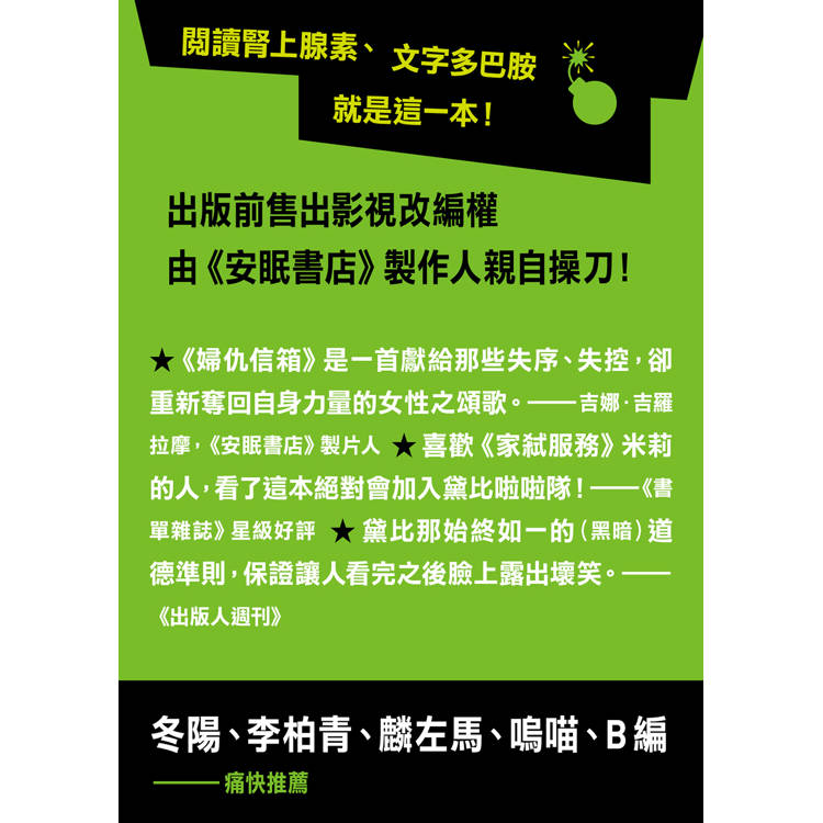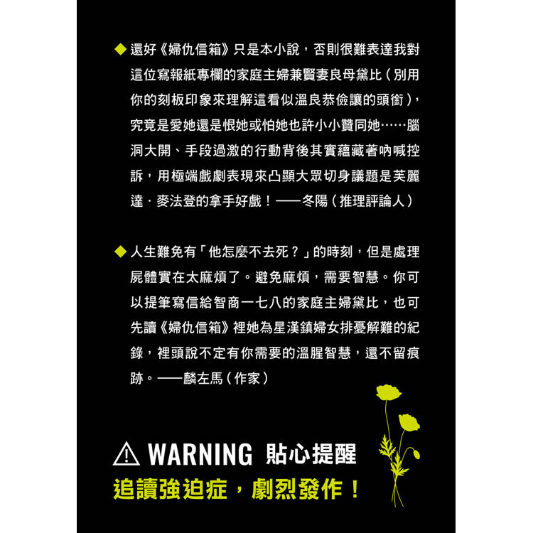 ▲還好《婦仇信箱》只是本小說,否則很難表達我對這位寫報紙專欄的家庭主婦兼賢妻良母黛比(別用你的刻板印象來理解這看似溫良恭儉讓的頭銜),究竟是愛她還是恨她或怕她也許小小贊同她……腦洞大開、手段過激的行動背後其實蘊藏著吶喊控訴,用極端戲劇表現來凸顯大眾切身議題是芙麗達.麥法登的拿手好戲!──冬陽(推理評論人)