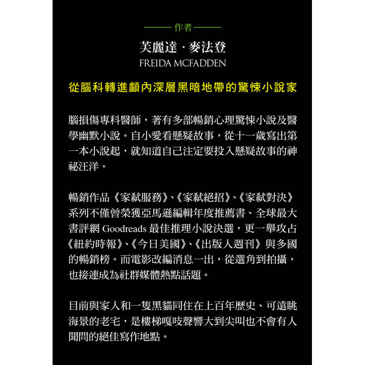 暢銷系列《家弒服務》、《家弒絕招》、《家弒對決》不僅橫掃全球書榜——榮登亞馬遜年度暢銷榜、Goodreads最佳推理小說決選,制霸《紐約時報》、《今日美國》、《出版人週刊》等多國榜單冠軍,隨即推出的改編電影從選角到預告、再到上映,每次釋出都引爆社群熱潮,成為全球矚目的焦點!最新作品《婦仇信箱》在出版前就賣出影視改編權,更在全美各地引發預購熱潮。