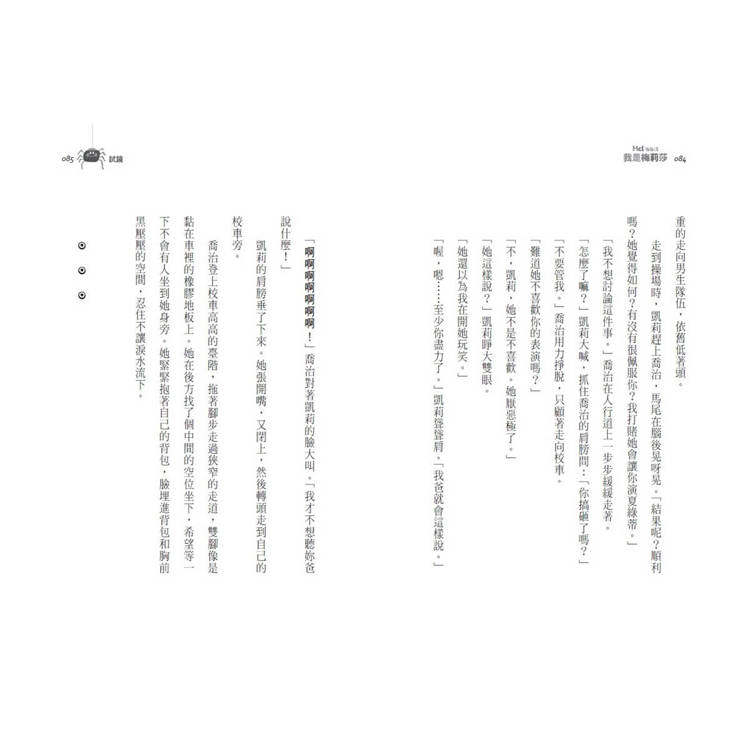 一顆淚珠滴在喬治的書上,立刻在書頁上擴散成了小小的蜘蛛網。她小心翼翼的呼吸,努力不要發出聲音。一次又一次淺淺的呼吸讓她頭暈,喬治便深呼吸一口氣,結果發出了類似擤鼻涕的聲音,而且很大聲。喬治聽見安靜的教室傳出清晰的低語。