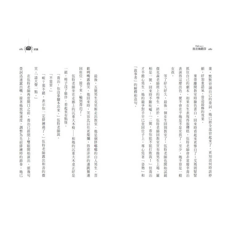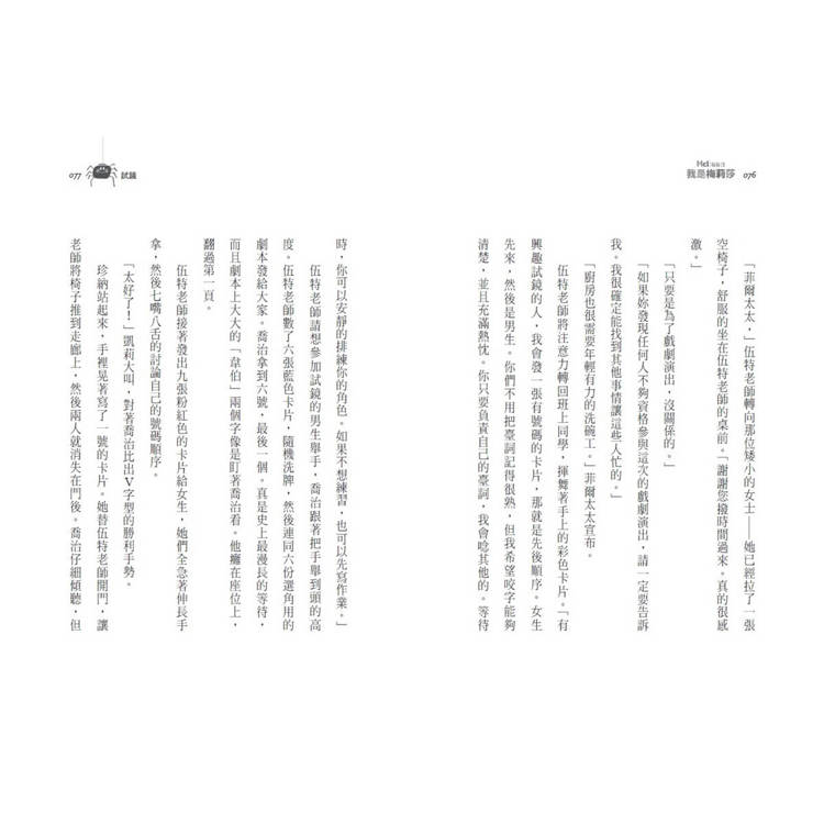 故事中,作家愛力·吉諾引用《夏綠蒂的網》來穿針引線,喬治強烈想要演出夏綠蒂一角的原因,除了明顯的性別認同,還有另一個隱性角度也值得我們思索。事實上,喬治被困在男性的身體裡,常因為多愁善感的柔弱特質被同儕取笑,更像是故事裡另一個主角:發育不良、隨時要面臨被放棄的小豬韋伯。但是,正因為喬治內心不甘淪為被動、被宰制的角色,她才渴望自己可以是身形更小卻更有力量、可以改變別人命運的夏綠蒂。