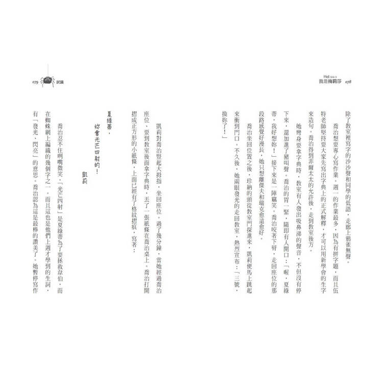 喬治慢慢打開教室的門,擔心會聽到笑聲,但同學都很專心寫著心得,沒人注意到她回來了。黑板上是伍特老師整齊的字跡:「個人心得」, 喬治拿出筆記本,寫上日期和題目。她才剛寫下夏綠蒂死了,寫作時間也到了。