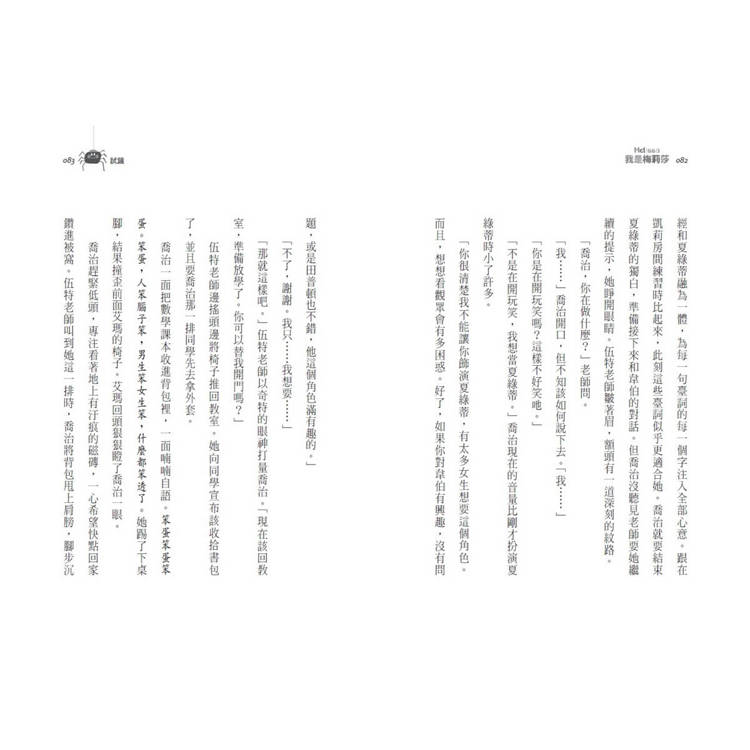 今年春天,喬治他們班上要演出《夏綠蒂的網》,而夏綠蒂是喬治夢寐以求的角色,她早已將臺詞背得滾瓜爛熟,更知道何時該加重語氣以營造最棒的戲劇效果。喬治深信,唯有自己才能在最後讓觀眾感動落淚。