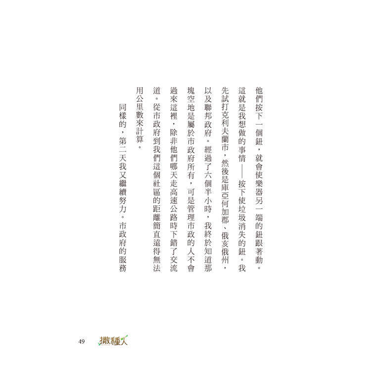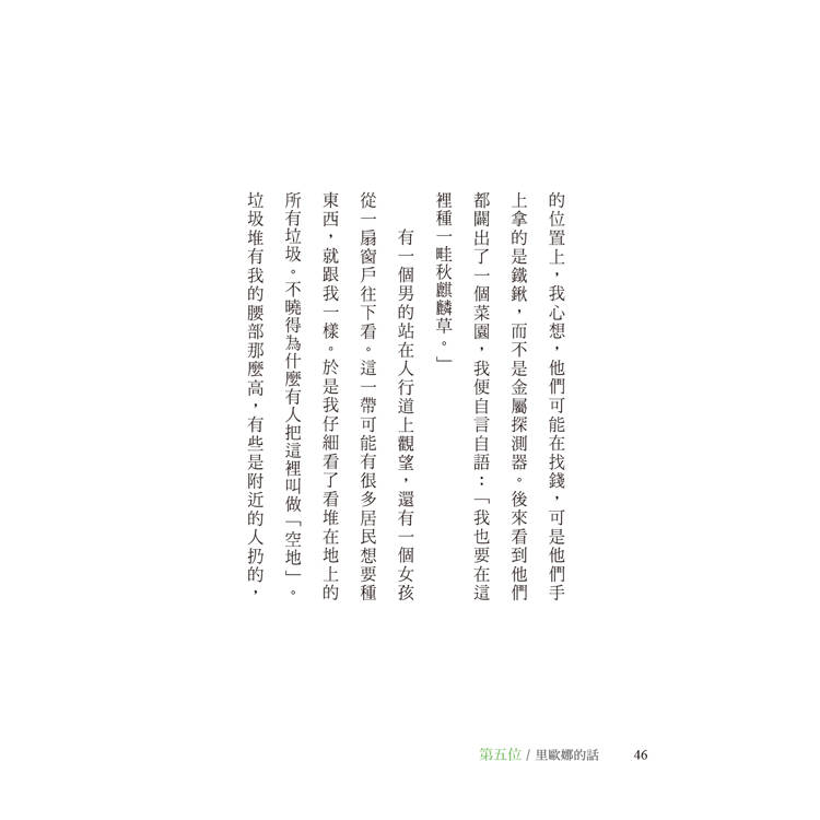 起先我不知道為什麼,後來就明白了。我這一生有很多事情改變不了,不能使死者復生,無法讓這個世界充滿溫情和友善,也沒辦法使自己變成百萬富翁。可是如果是垃圾堆裡的一小塊地面,就沒有問題了,我可以大大改變它。與其整天為其他事情唉聲嘆氣,不如把時間花在這上面。那個年幼的小學女生告訴了我這一點。