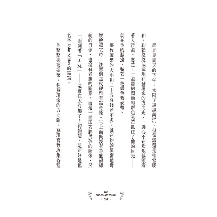 約翰.邁達斯什麼都不愛,就愛吃糖果,對他來說,世界上沒有比巧克力更迷人的食物。有一天,他在路上撿到一枚神祕硬幣,用它在糖果店買了一盒巧克力。就在他吃下裡面的巧克力之後,神奇的事竟然一件接一件發生了——凡是他嘴巴碰到的一切,通通都會變成巧克力!