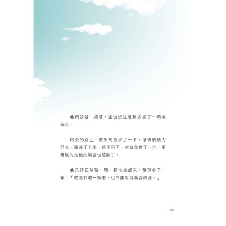 他們談著、笑著, 誰也沒注意到多摘了一顆紫草莓。回去的路上, 賓果馬被絆了一下, 可憐的酷力亞克一頭栽了下來,籃子飛了,紫草莓撒了一地,更糟糕的是他的嘴唇也磕腫了。他只好把草莓一顆一顆地撿起來, 發現多了一顆,「乾脆我嚐一顆吧,也許能消消嘴唇的腫。」