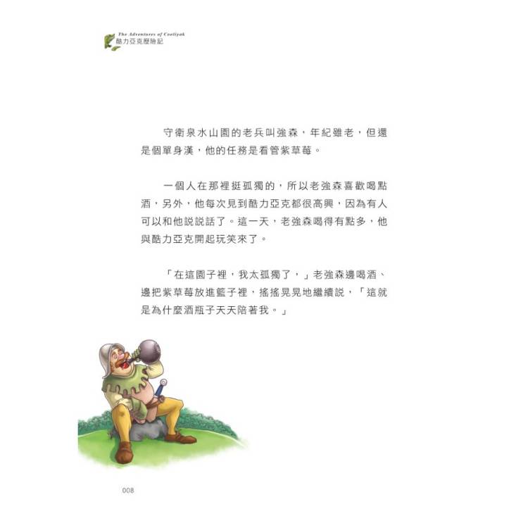 守衛泉水山園的老兵叫強森, 年紀雖老, 但還是個單身漢,他的任務是看管紫草莓。一個人在那裡挺孤獨的, 所以老強森喜歡喝點酒,另外,他每次見到酷力亞克都很高興,因為有人可以和他說說話了。這一天,老強森喝得有點多,他與酷力亞克開起玩笑來了。「在這園子裡,我太孤獨了,」老強森邊喝酒、邊把紫草莓放進籃子裡,搖搖晃晃地繼續說,「這就是為什麼酒瓶子天天陪著我。」