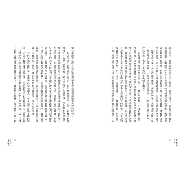 但巴克既不是養在室內的狗,也不擠在外頭的犬舍,這裡全是他的領土。他會跳進泳池,陪法官的兒子們游泳,也會跟著他們去打獵,或在黃昏和清晨時分,護衛法官的女兒莫莉和愛麗絲外出散步。冬天的夜晚,在書房裡猛烈燃燒的爐火前,他躺在法官的腳邊。他會馱著法官的孫子,陪他們在草地打滾,或亦步亦趨護衛他們到馬廄所在的院子,去那裡的噴水池探險,有時他們甚至會跑到更遠的地方,比如牧馬的小圍場或莓果園。在從那群獵狐㹴中間走過時,他專橫而跋扈,更視突茲和伊莎貝如無物,因為他是國王——在米勒法官的莊園,所有走的、爬的、飛的生物都要臣服於他,包括人類也是。