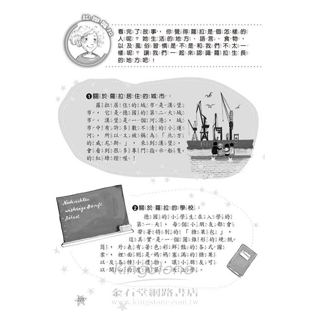 4、每章皆設計思考題、書末附「認識蘿拉」單元,讓孩子能想想問題、整理心得,以及提升國際觀。