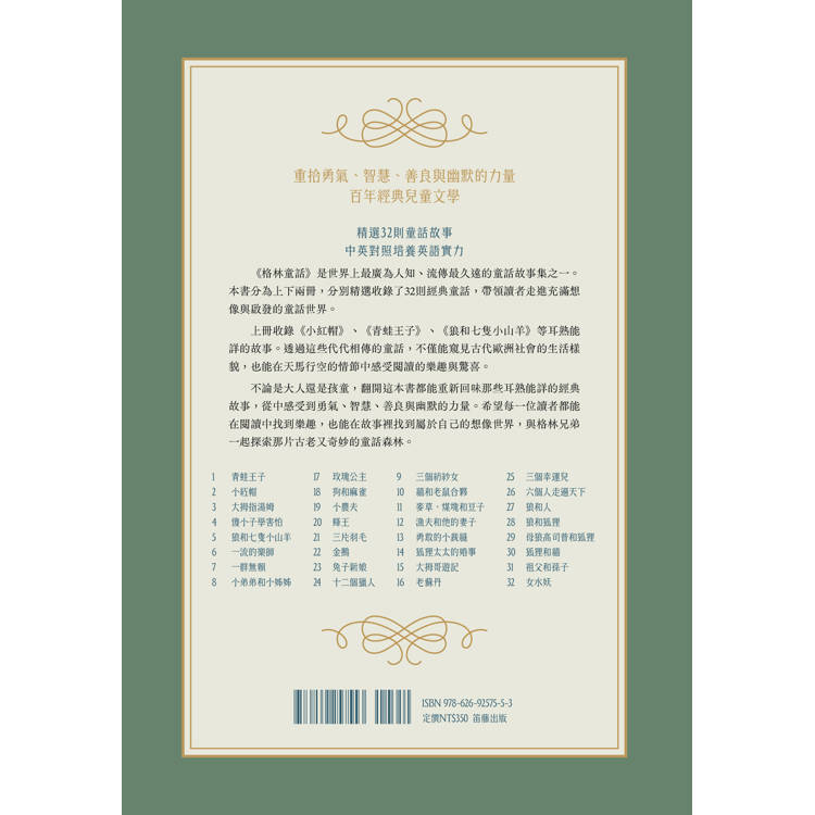 本書《世界經典文學:格林童話 穿越古老的故事之門×收錄64篇經典童話故事(中英對照)》共分為上下冊,每冊收錄三十二篇精選故事,特別添加了英文對照版本,讓讀者在欣賞經典童話的同時,也能提升英語能力。這並不是單純的語言學習,而是一場伴隨故事節奏的奇幻旅程;每篇故事都是一扇門,引領讀者穿越森林、城堡與魔法世界,親身感受語言的韻律、故事的張力與文學的魅力。