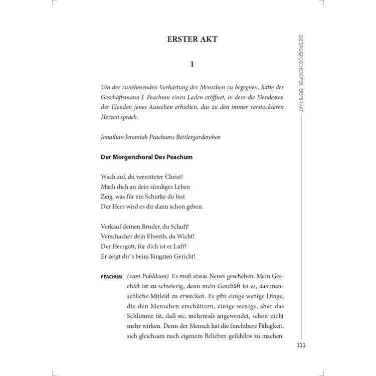 時至今日,許多劇場人尋找新的音樂文藝作品,希望能夠一炮而紅,心中總想著:「做一部像《三便士歌劇》的(作品)吧。」這個目標看來容易!只要情節簡單,帶點娛樂色彩,配合鮮明的角色,加上足量的「性與犯罪」的佐料,再搭配幾首節奏鮮明的歌曲,讓劇院小樂團可以演奏,演員也可以直接演唱,這樣應該就十拿九穩了,再簡單不過。但除了羅伯・威爾森(Robert Wilson)搭配流行文化偶像威廉・布洛斯(William Burroughs)與著名音樂人湯姆・威茲(Tom Waits)攜手創作的《黑騎士》(The Black Rider),我指的當然是那部以戲謔口吻自《魔彈射手》(der Freischütz)改編的作品,除此之外,近百年來幾乎沒有人能真正重現這種戲劇奇蹟。