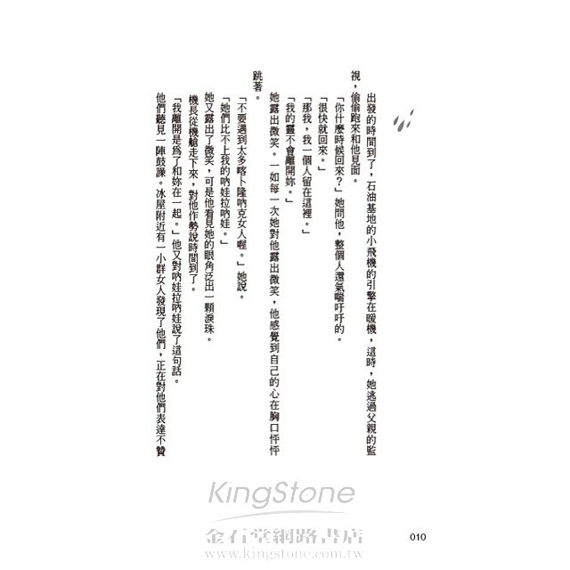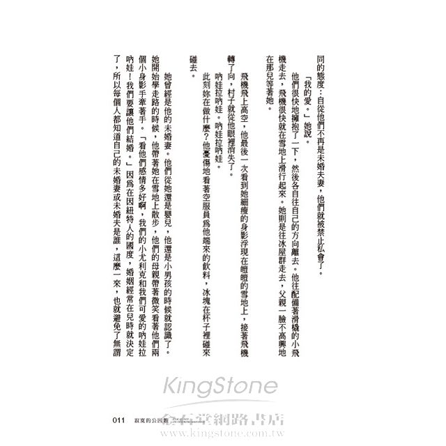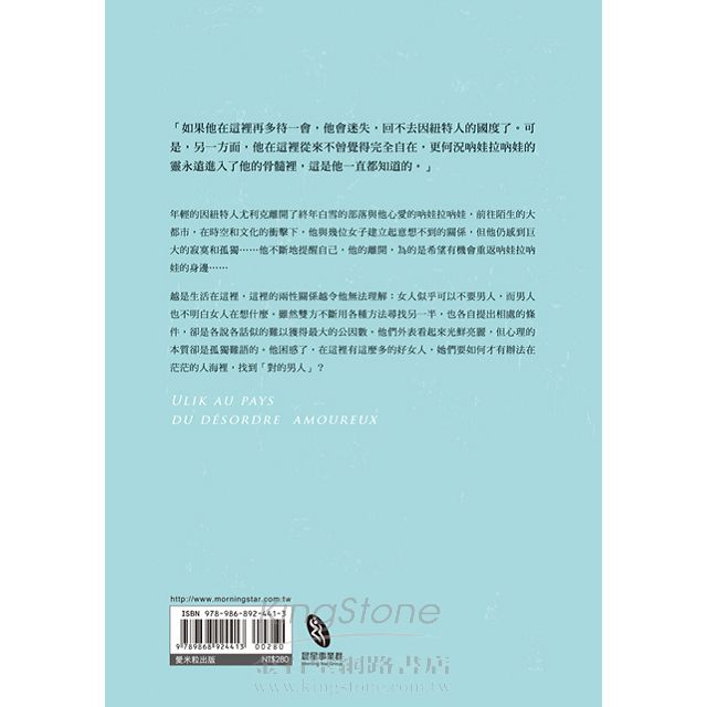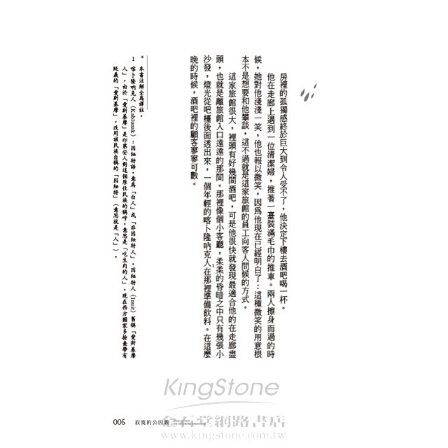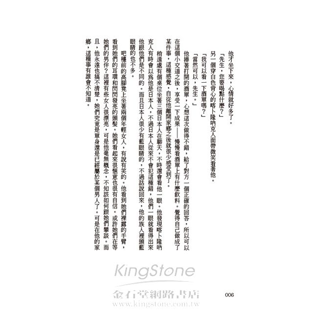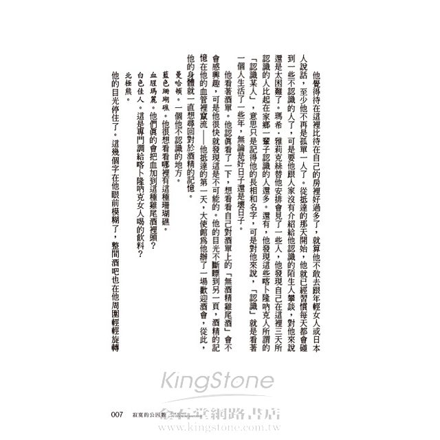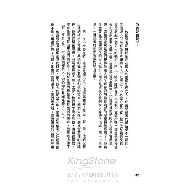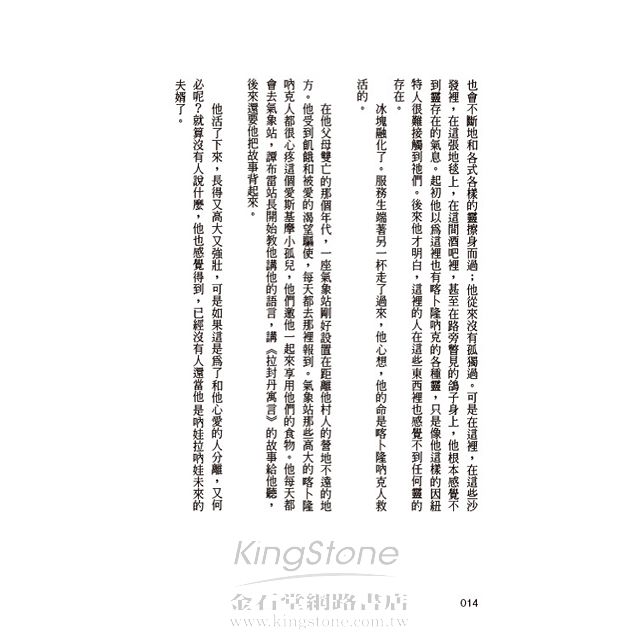 一陣羞愧襲了上來。他不是不知道,酒,這種喀卜隆吶克人的發明可以讓人變得跟小小孩一樣手腳不協調,語無倫次。他想起大使館的酒會,眾人同情的目光──大家看到一個胖女人顯然因為喝了太多烈酒,在那兒放聲大笑,後來她試著要坐下的時候,竟然從椅子上摔了下來。他不想感受到吧台那兩人目光中的同情,他是個驕傲的因紐特人,只有小孩和女人才能讓人同情而無損於榮譽。他站起來,覺得地板好像變成一大片正在融解的大浮冰,一大塊、一大塊的冰板在腳下跳著舞。可是沒有問題,他從小就受過這種訓練,所以他可以一直走到吧台。