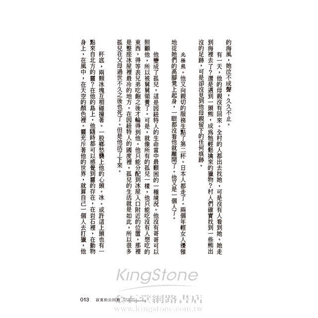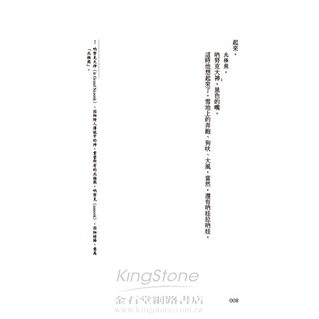 「如果他在這裡再多待一會,他會迷失,回不去因紐特人的國度了。可是,另一方面,他在這裡從來不曾覺得完全自在,更何況吶娃拉吶娃的靈永遠進入了他的骨髓裡,這是他一直都知道的。」