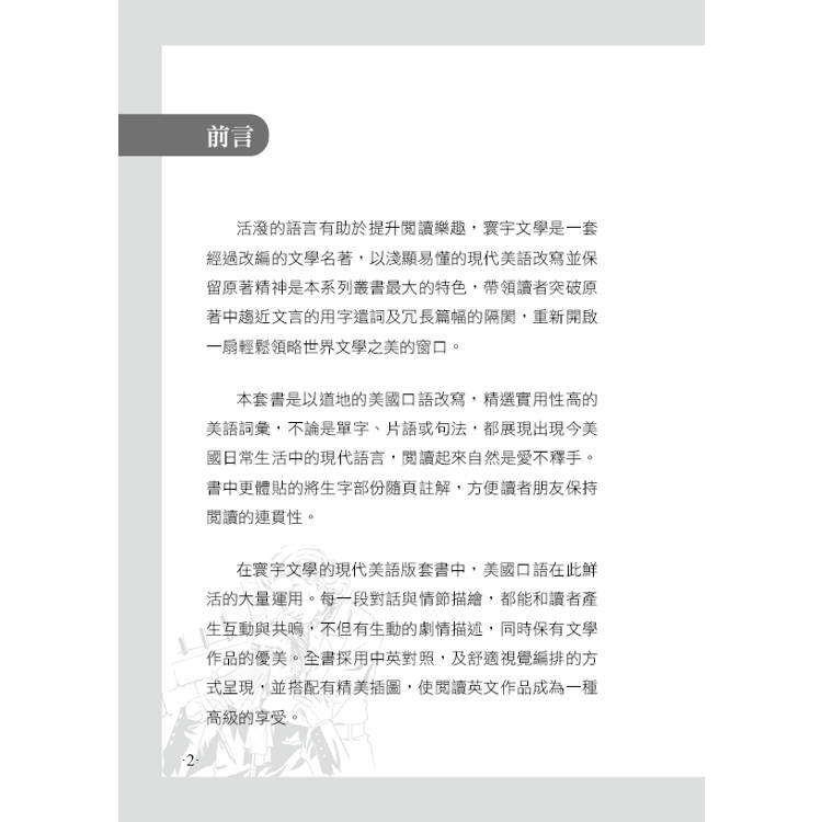 書中更體貼的將生字部份隨頁註解,方便讀者朋友保持閱讀的連貫性。在寰宇文學的現代美語版套書中,美國口語在此鮮活的大量運用。每一段對話與情節描繪都能和讀者產生互動與共嗚,不但有生動的劇情描述,同時保有文學作品的優美。
