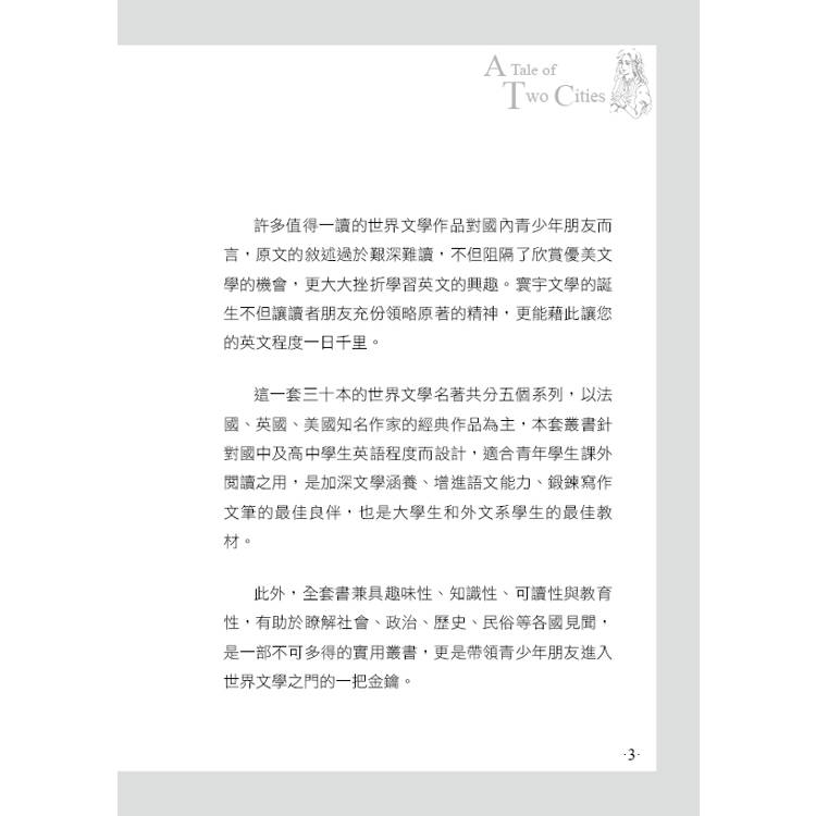這一套三十本的世界文學名著共分五個系列,以法國、英國、美國知名作家的經典作品為主,本套叢書針對國中及高中學生英語程度而設計,適合青年學生課外閱讀之用,是加深文學涵養、增進語文能力、鍛鍊寫作文筆的最佳良伴,也是大學生和外文系的最佳教材。