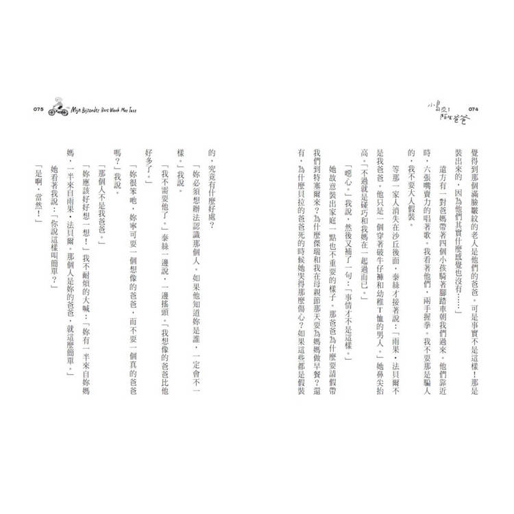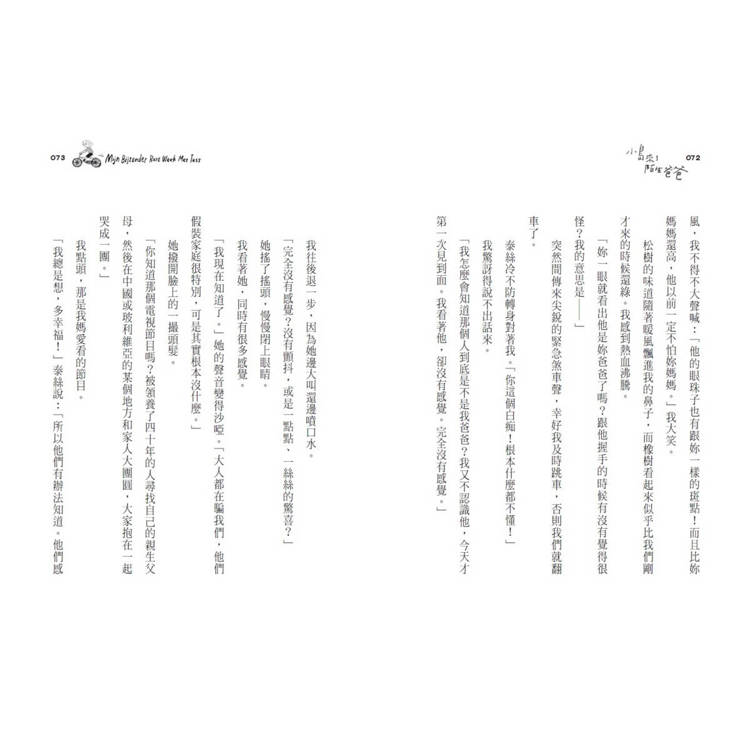 然後,當我讀到山姆遇到泰絲,發現泰絲沒有爸爸,而且泰絲的媽媽竟然直接告訴女兒:「這樣兩個人過日子很好,我們不需要男人」、「就是因為女人太常說對不起,才會被小看」時,我更加確定,這本書大概不會是出自於觀念保守的亞洲,故事背景一定是在一個女性意識強烈、兩性平等,而且社會福利健全的地方,才能讓女人能夠勇敢的說出這樣「有氣魄」的話,並且一肩挑起撫養女兒的責任。