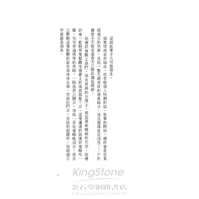 如果情況並非如此,或者能如人所願的話,故事的開始,應該會是在某個週日的早晨,在他一整天最美好的清晨時分,而且還得是在四月──介於蕭瑟冬天和充盈春天之間的尷尬時節。