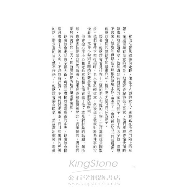 他應該會走到肯辛頓大街,嘴裡咕噥抱怨著剛消逝的冬天。他應該會懊惱沒帶妻子去義大利,不過旅費昂貴,不可能說走就走,而且如果真的要去的話,辦公室的日子就不好過了。他應該會獨自嘆氣,然後露出微笑,看著倫敦的天色漸漸由黑轉灰,再由黃變藍。