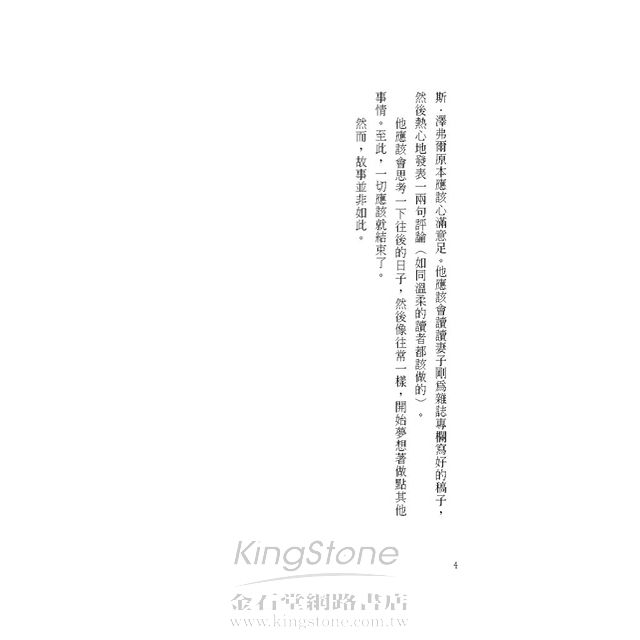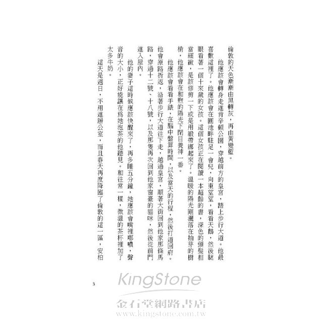 他應該會轉身走進肯辛頓公園,穿越前方的皇宮,踏上步行大道。他最喜歡這裡了。他應該會在圓池畔駐足一會兒,向東望望,看看天鵝,然後瞇眼看著一個十來歲的女孩。這個女孩正在閱讀一本超齡的書,深色的頭髮相當細緻,是該修剪一下或是用緞帶綁起來了。溫暖的陽光剛灑落在抽芽的樹梢,他應該會在和煦的陽光下閉目養神一番。