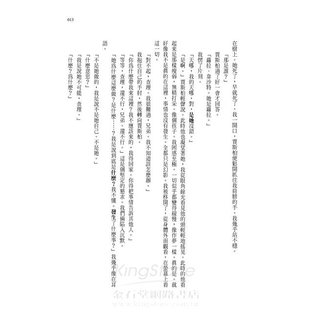 「是啊。」賈斯柏輕聲說。此時他也凝望著她,我從眼角餘光看見他的頭輕輕地搖晃。此時的他看起來是那樣瘦弱,無精打采。像個孩子。我困惑至極。一切似乎都變得緩慢,像作夢一樣。真的是。就好像我不是真的在這裡,事情也沒有發生。全都只是幻影。我被移開了,從身體外面觀看,在螢幕上看這一切。