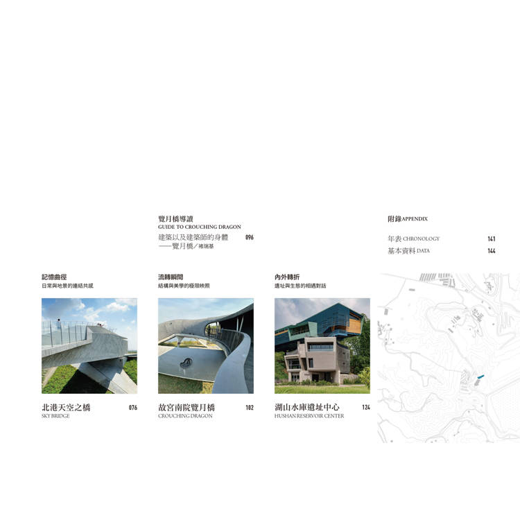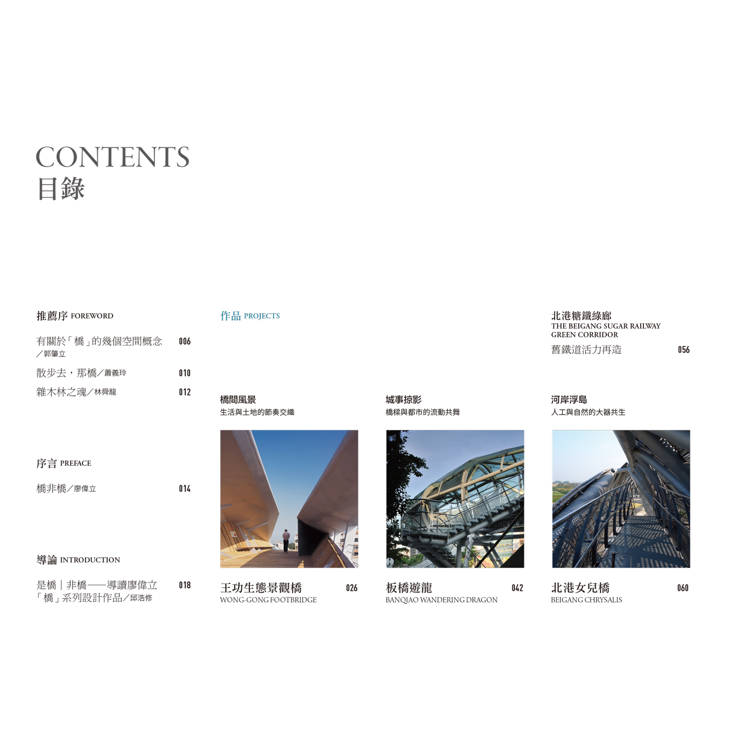 廖偉立建築師最新作品集收錄其最具代表性的橋樑設計,包含彰化王功生態景觀橋、板橋捷運人行橋「板橋遊龍」、北港女兒橋、天空之橋,以及近年的故宮南院覽月橋、「橋體建築」湖山水庫遺址中心——這些作品記錄了他的創作歷程,也具體呈現他長久以來對「日常地方感」與「永恆精神性」的思考與追求。