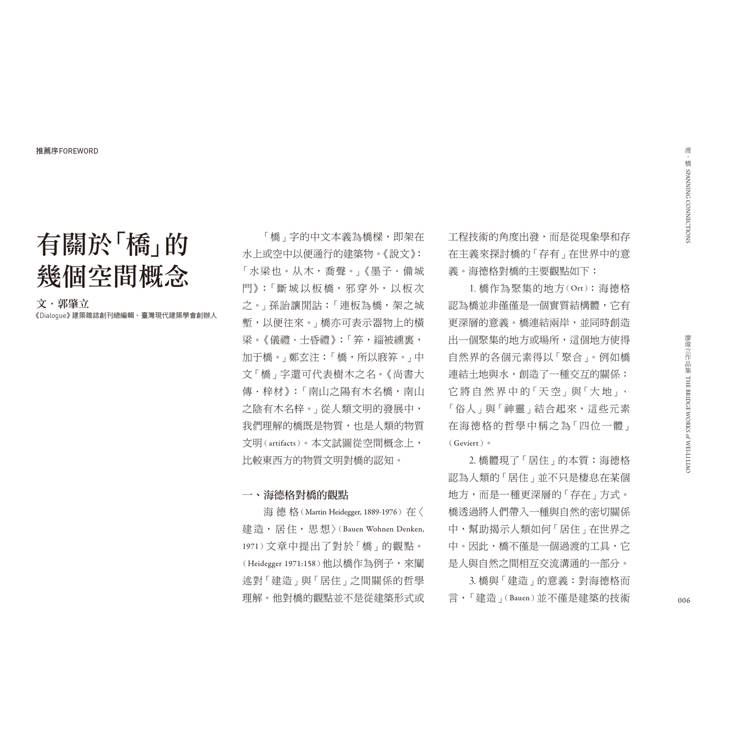從最初的桃園東眼山公廁開始,廖偉立的「雜木林」美學追求建築應如自然生態般多元共存,他的橋樑設計同樣體現「是橋|非橋」的複調思考——既是物質結構,也是景觀雕刻;既是穿越的路徑,也是停留的場所。本書邀讀者走入橋中,讓心靈沉澱、身體緩慢下來,隨著專業導讀了解其設計語言,並細細感受這些承載台灣土地記憶的空間。