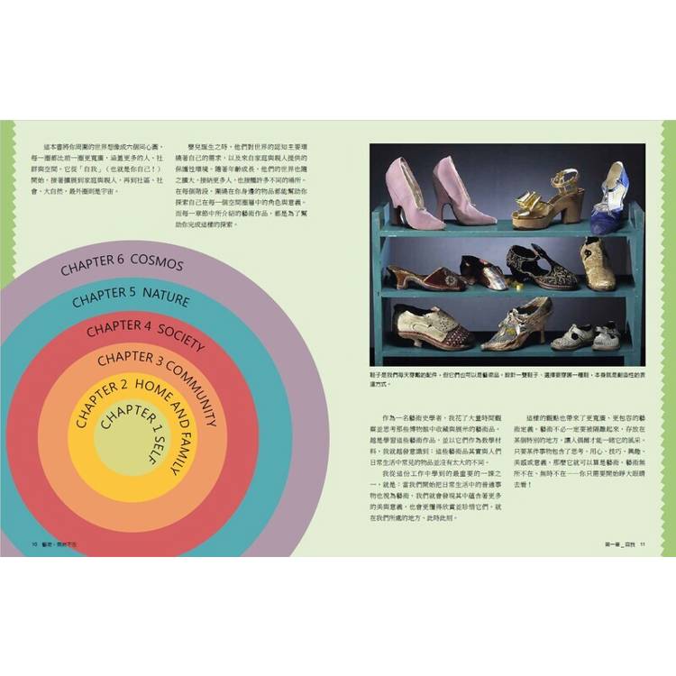 藝術史學者司徒曉巧妙地以六大同心圓作為架構,從每個人最切身的領域,逐漸擴展到宇宙,在六大範疇──自我、家庭、社群、社會、自然、宇宙,我們能發現藝術無所不在,並學習如何以「美」的覺察來看待我們所處的這個世界。