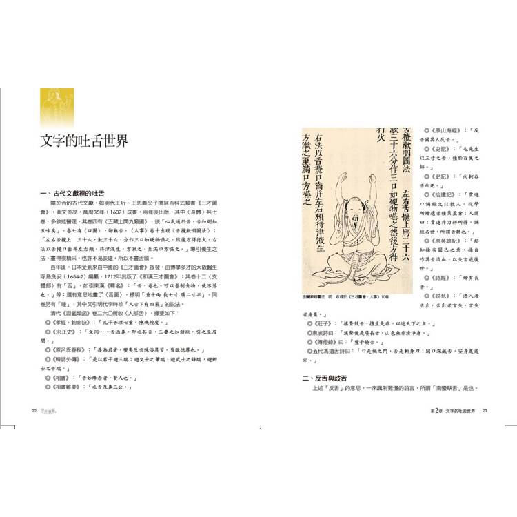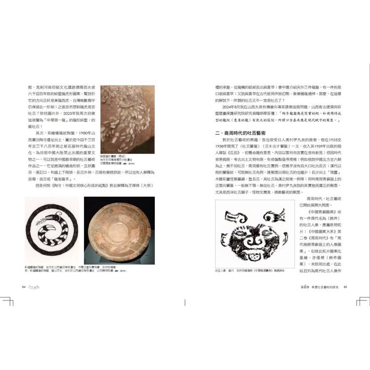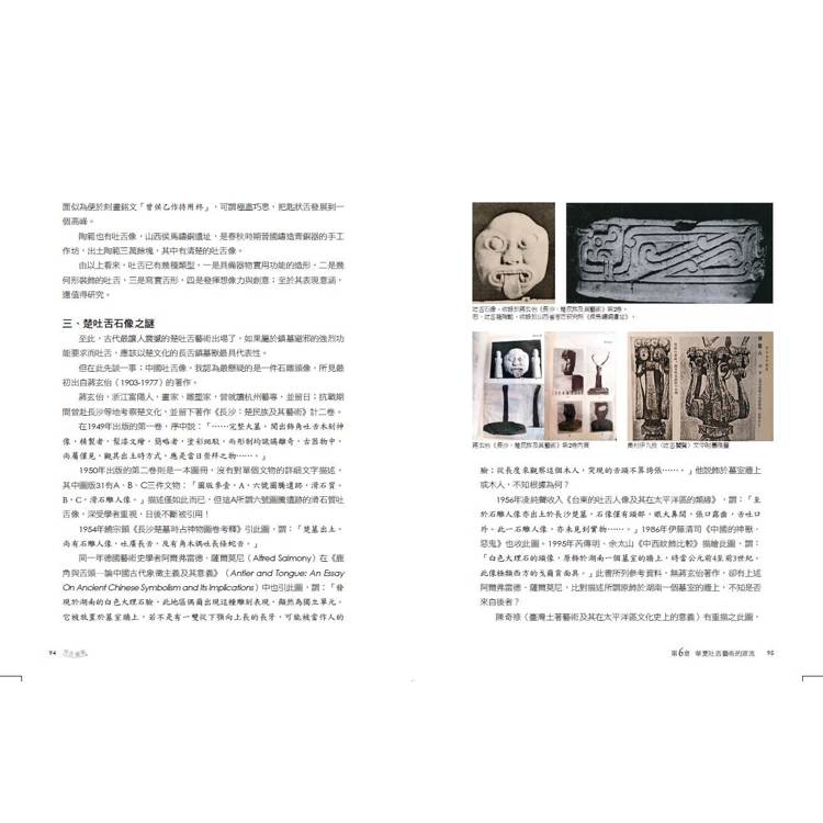 但並未就此滿足,日後偶爾想起吐舌,總覺生活體驗中有些印象仍滯留在童年時段,恰似舌頭平時躲在嘴巴裡,不輕易露出;回溯奧村,因時代背景侷限,考古出土文物、民俗調查材料有限,有些論點尚值得商榷,例如他說中國北方至六朝為止,幾不知吐舌,商周雖有吐舌實例,但幾乎沒有自大口吐出長舌;漢代以前的饕餮紋可說無吐舌先例,連獸面出現吐舌的也極少;長沙出土「殘豐」木雕彩畫怪獸墓鎮,垂長舌,其吐舌為漢之前唯一例,同時商周青銅器上的正面向饕餮,一般無下顎,無從吐舌等等;奧村說的其實包括廣泛的獸面,尤其是西洋吐舌獅子、怪物戈爾貢、佛教藝術的獸面。