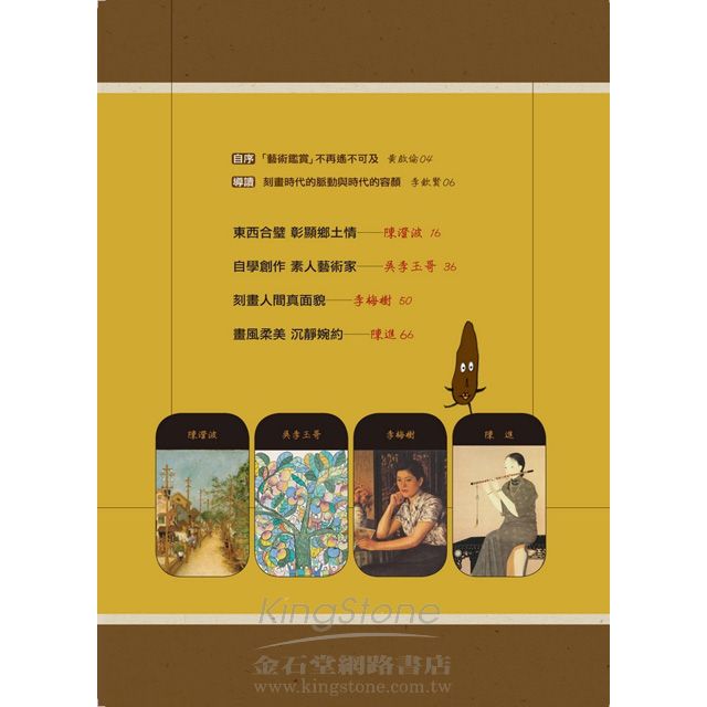 本書介紹的畫家各有施展不同媒材的專長,包括了油畫、水彩、膠彩和水墨等。至於風格特色,有寫實的、寫意的、變形的、童心的、靈異的多元創意,構成了臺灣近代美術有如萬花筒般繽紛多樣的世界。不管你熟悉或特別喜愛書中哪一位畫家的作品,那也就是臺灣近現代美術的代表作之一。你所欣賞的那一幅作品,必是臺灣文化的縮影,同時也是進入臺灣美術的敲門磚。