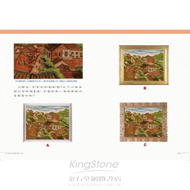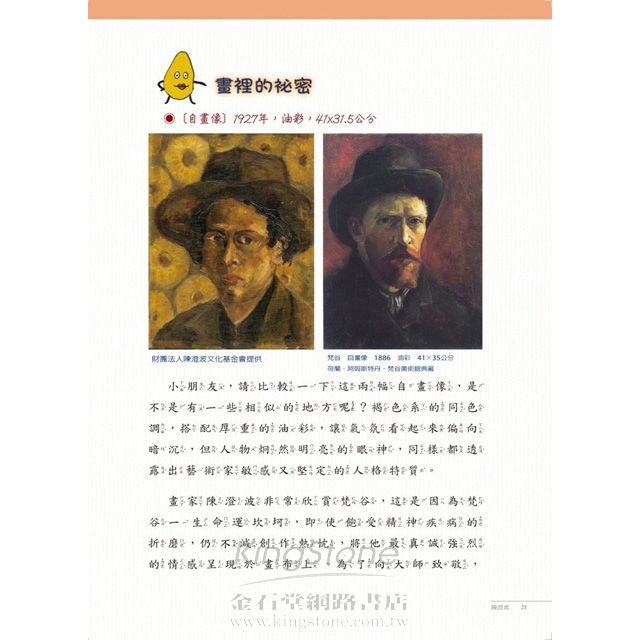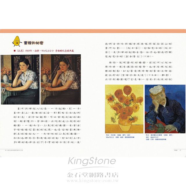 各篇內容設計成兩大單元:一、介紹畫家藝術創作的歷程,是以「說故事」的方式簡述臺灣前輩畫家的心路歷程,同時瞭解他們時代的思想、情感以及價值觀。二、「畫裡的祕密」單元,則是深入淺出地引領小朋友欣賞畫作之美,以及提供相關的美學知識,結合具啟發性和鑑賞理論的藝術活動,小朋友在有效吸收內化之後,不僅能達到美學素養的提升,更能享受「藝術欣賞」的趣味!