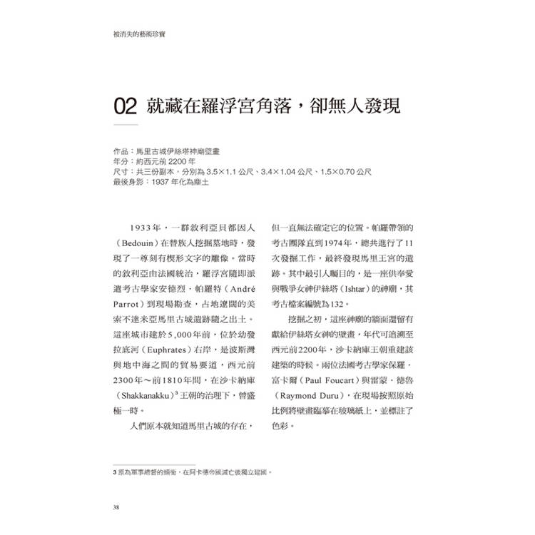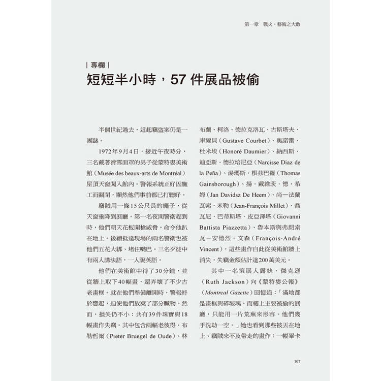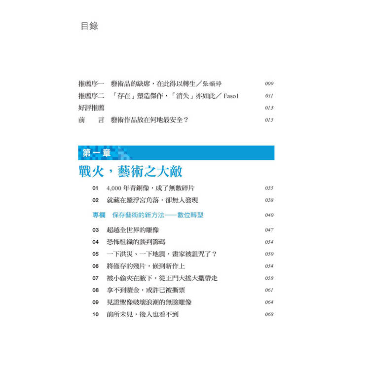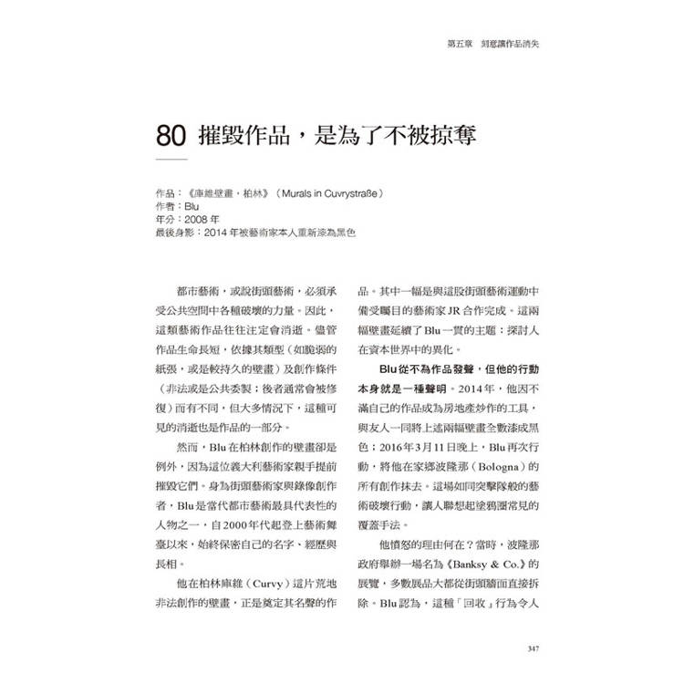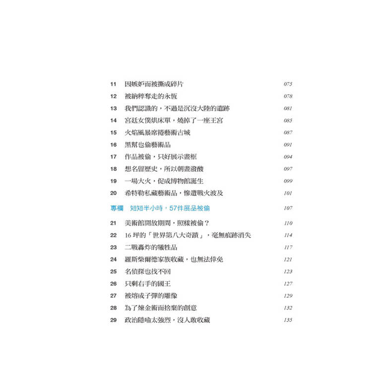 各位看到的,是張未完的清單,本書是一種嘗試,企圖探詢種種讓藝術消失的可能途徑。法國作家保羅.瓦勒里(Paul Valéry)曾寫道:「書籍與人類有共同的敵人:火、溼氣、野獸、時間,以及它們本身的內容。」這種說法亦適用於藝術品,而且在這份名單中,還要再加上一項「偶然」。