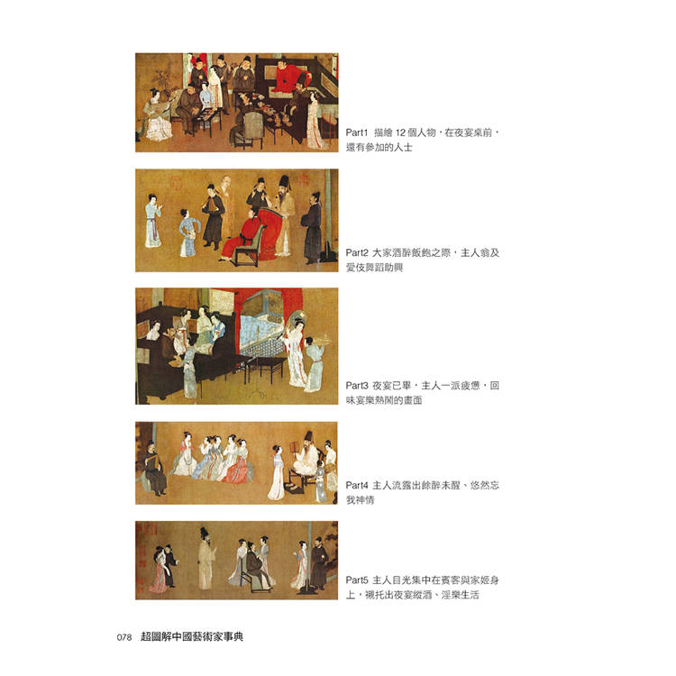 然夜宴圖的每節,均以主人韓熙載為中心畫題,並刻畫出他所處的環境,與他周圍人物的行動。對主人翁的動作關係,真是表現得維妙維肖,栩栩自然,把每個人的身分也都恰如其分地描繪出來!