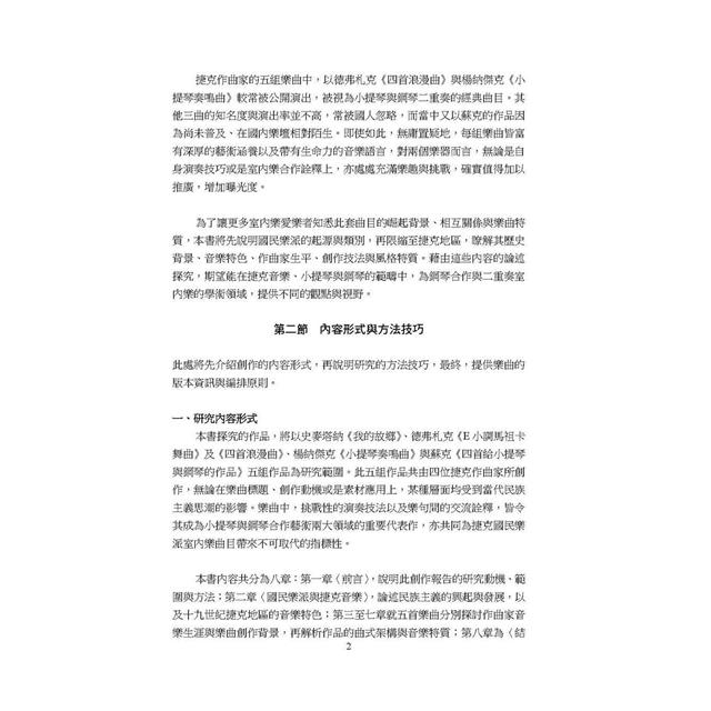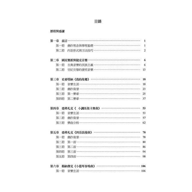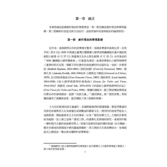 為了讓更多室內樂愛樂者知悉此套曲目的崛起背景、相互關係與樂曲特質,本書將先說明國民樂派的起源與類別,再限縮至捷克地區,瞭解其歷史背景、音樂特色、作曲家生平、創作技法與風格特質。藉由這些內容的論述探究,期望能在捷克音樂、小提琴與鋼琴的範疇中,為鋼琴合作與二重奏室內樂的學術領域,提供不同的觀點與視野。