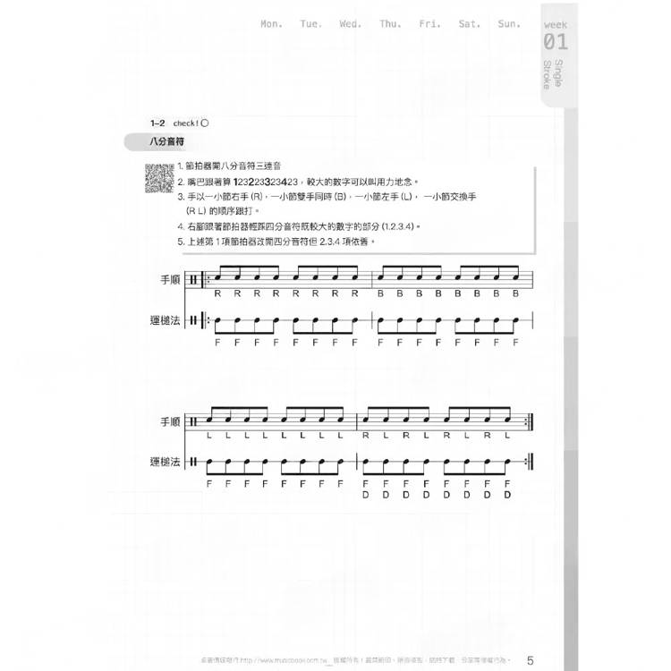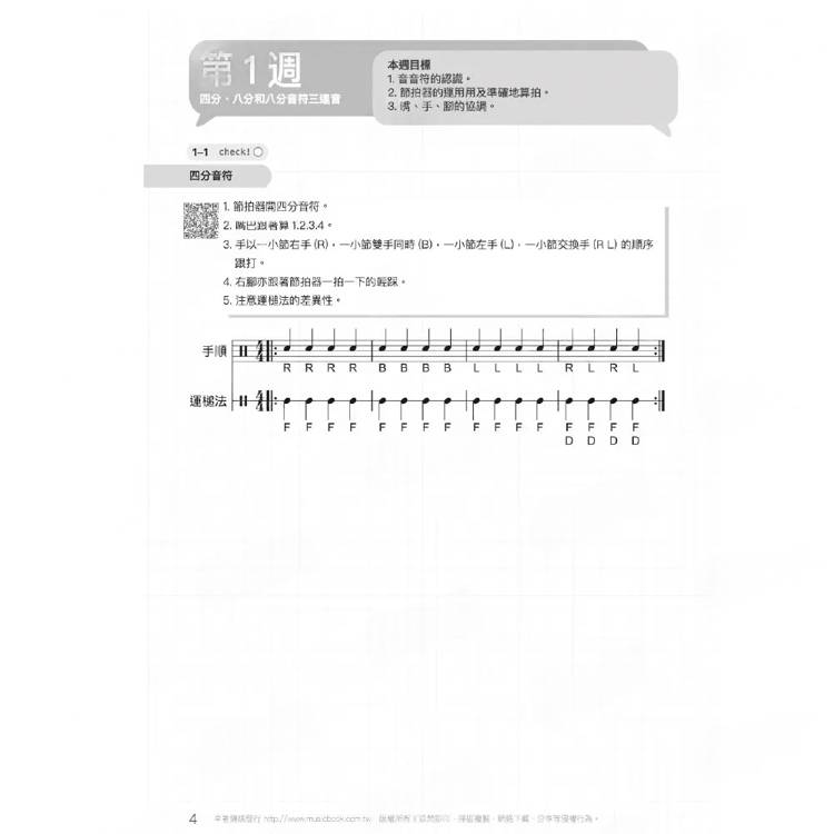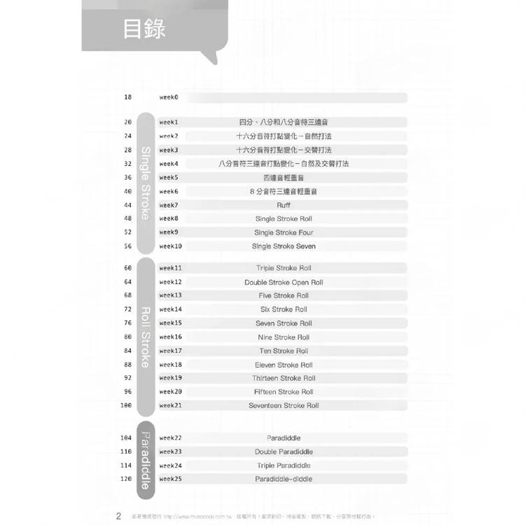 這是一本工具書,所謂的工具書就是可以每天與他為伍的熟練他,或是如查字典一般,有需要的時候可以隨手查閱。40 Rudiments由 美國打擊樂協會(Percussive Arts Society, PAS) 於1989年所整理發佈。是每個不同領域的打擊樂手,或是對打擊有興趣的朋友最好的入門途徑。本書以其為基底,再增加一些常見的變化形,形成每週的練習。且輔以影像及不同打擊樂器的示範,讓讀者可以更快的上手,且更多元的運用。請帶著輕鬆的心情每天拿出來打個5-10分鐘,和喜愛的樂器琣養一下感情,相信您在樂器的操控上會有一定的成長。