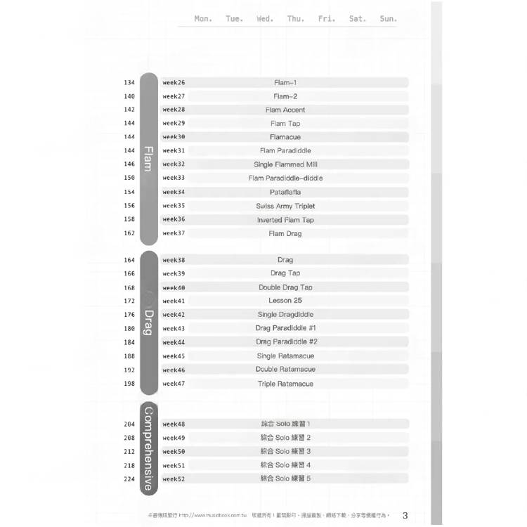 Week 26–37 : Flam 前擊技巧 (Flam Accent, Flamacue, Swiss Army Triplet 等)